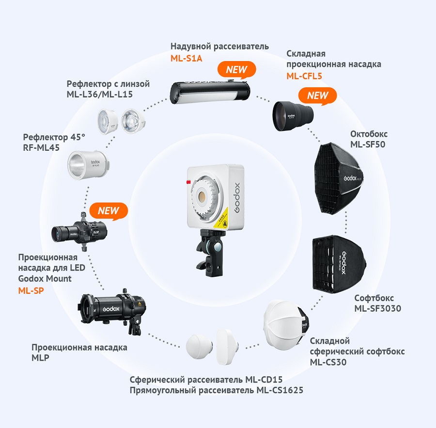 Godox ML100R — компактный светодиодный осветитель профессионального класса, ориентированный на фото- и видеосъёмку в студии и на выезде. Модель сочетает высокую мощность для своего форм-фактора, полноценный RGB-функционал и гибкие возможности управления, что делает её универсальным инструментом для креативного света.