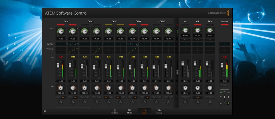 Микшер поддерживает два стереовхода 3,5 мм для микрофонов или внешнего звука. Благодаря встроенному микшеру Fairlight можно регулировать громкость, баланс и применять эффекты, включая компрессор и эквалайзер.