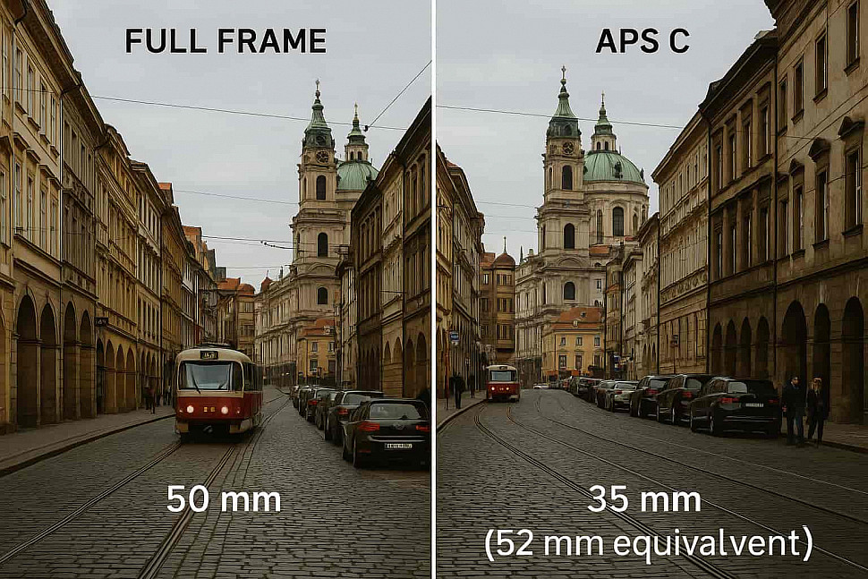 Если сделать снимок на полный кадр, а потом в редакторе обрезать изображение по центру до размера, соответствующего матрице APS C, вы получите картинку очень близкую к тому, что дала бы кроп камера с тем же объективом и тем же фокусным расстоянием.
